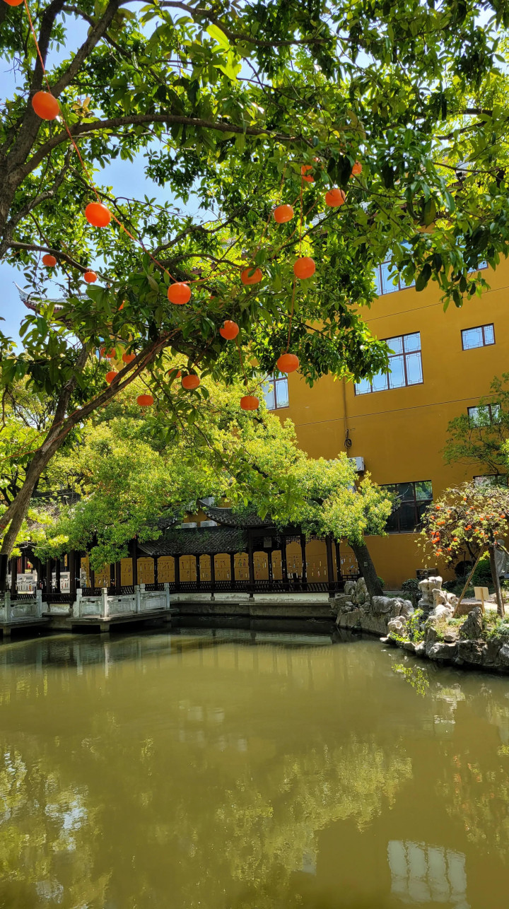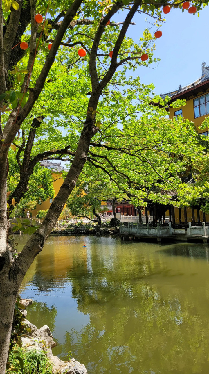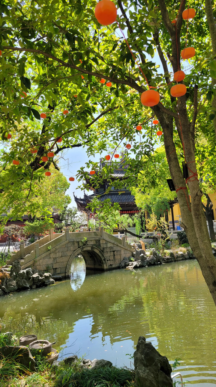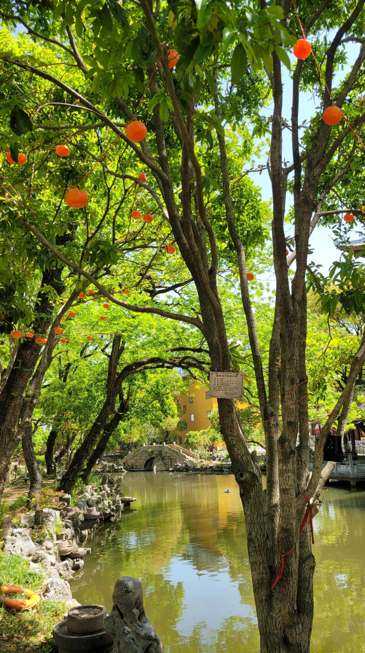 在寺庙的后面,有几处池塘,在池塘旁边,建有亭台楼阁,同时,在池塘周围,种有不少树木,树木上挂有小灯笼,如同成熟的西红柿,看上去比较漂亮。